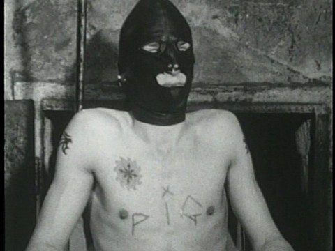 Genitalien, er ritzt das Wort Pig mit einer Rasierklinge in seine